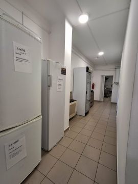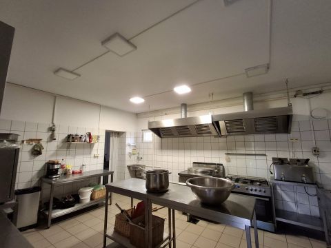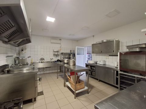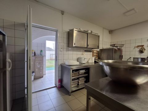 A hátsó részen külön épületben 80 m²-es, teljesen engedélyezett üzemi konyha található, ahol korábban menüs étkeztetés és rendezvényszervezés működött. Kiváló lehetőség vendéglátósoknak, cukrászoknak, catering szolgáltatóknak vagy akár egy új lakóegység kialakítására.
