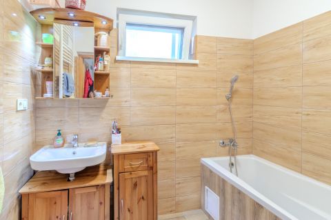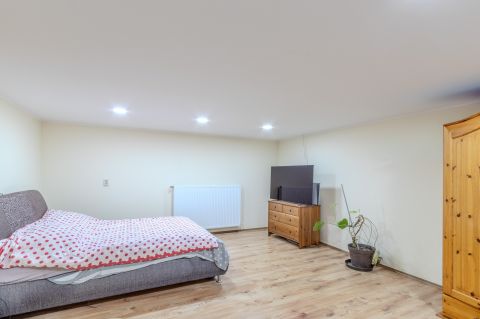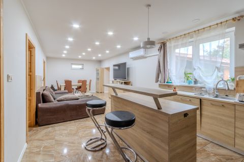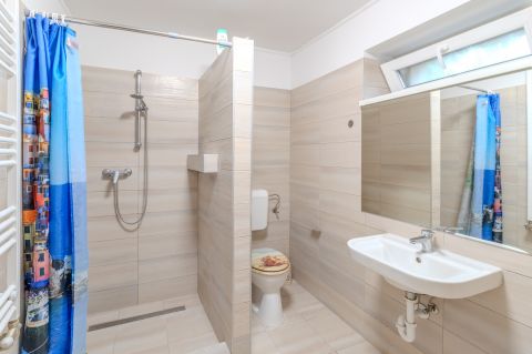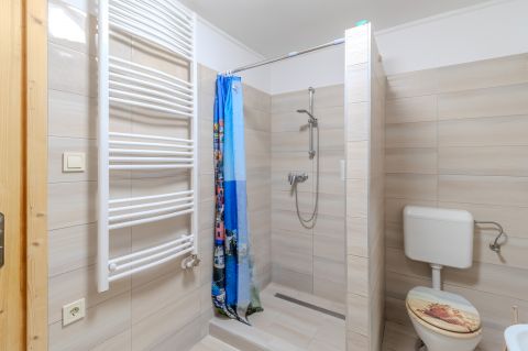 A külön bejáratú, teraszos rész önálló lakrészként vagy apartmanként is működtethető, külön fürdőszobával.