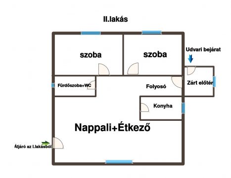Nagyobbik lakrészben: előszoba, konyha-étkező, 2 szoba, fürdőszoba, wc.