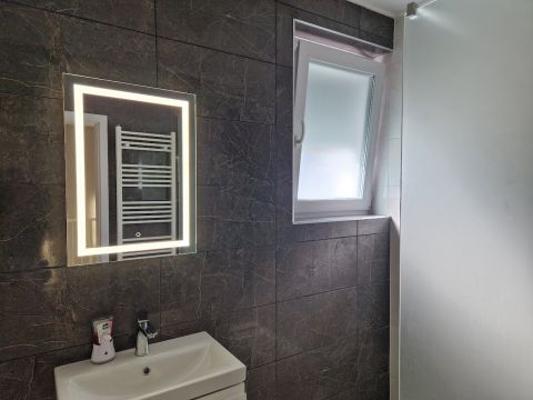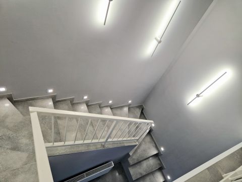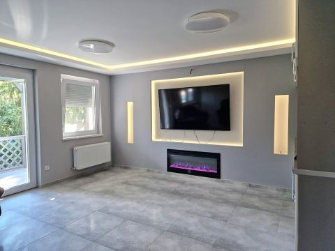 Prémium minőségű burkolatok mindenhol, beépített led világítások, látványkandalló teszik különlegessé ezt az újszerű házat.