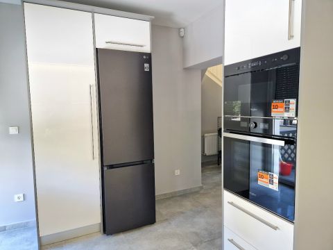 A lakótér első emeletén hatalmas világos, nappali van, tágas keleti fekvésű terasszal. Külön konyha, 4 millió forintos igényes bútorral, plusz a beépített minőségi gépekkel. A kettő között a család étkezője kapott helyett.