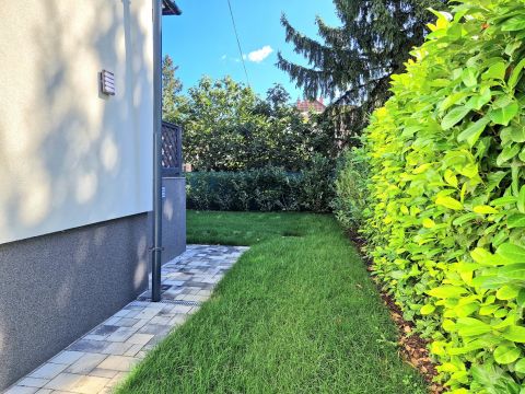 A hátsó füves kisudvar elszeparált, az oldalsó kert térkővel fedett.