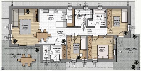 Az ingatlan 3 szoba + nappali elrendezésű, a terasz kellemes lehetőséget biztosít pihenésre, valamint a nappali természetes meghosszabbításaként szolgál a jó időben.