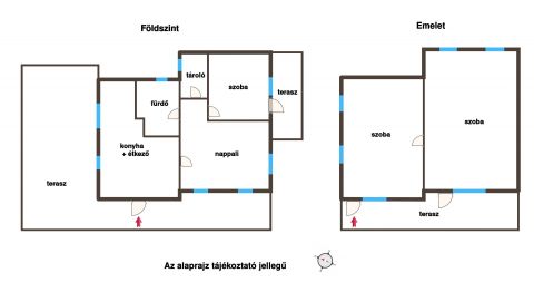 A 150 m²-es ház földszintből, emeletből és teraszokból áll. A földszinten nappali, konyha, hálószoba, fürdőszoba és háztartási helyiség található, az emeleten pedig két tágas helyiség kapott helyet, amelyek igény szerint tovább oszthatók. Ez a kialakítás lehetőséget ad akár két külön bejáratú apartman létrehozására is, így az ingatlan befektetésnek is remek választás.