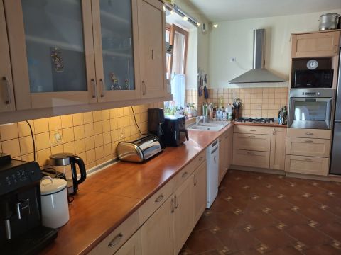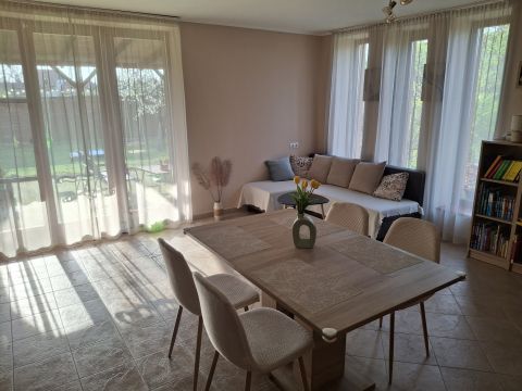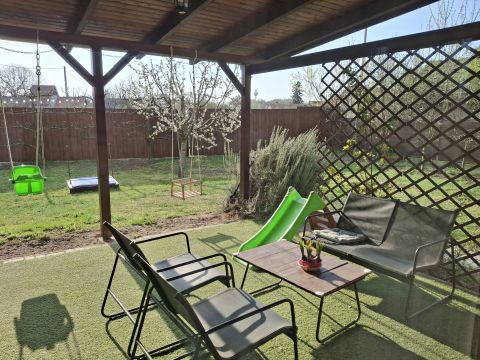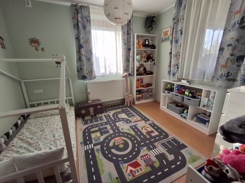 A nappaliból egy kellemes, 16 m2-es, a közelmúltban felújított teraszra is kiléphetünk, mely remek helyszíne lehet pihenésnek, játéknak. A ház ezen része azonnal költözhető állapotú, ízlésesen berendezett. A teljes ingatlan rendszeresen karbantartott.