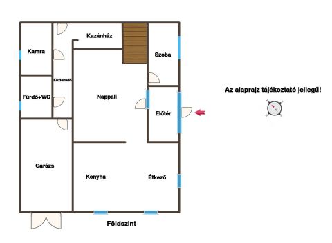 A földszinten nappali, konyha+étkező, szoba, fürdő+wc, kamra, kazánház, valamint egy zárt szimpla garázs található.