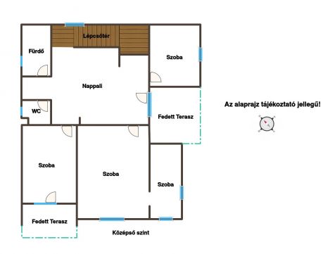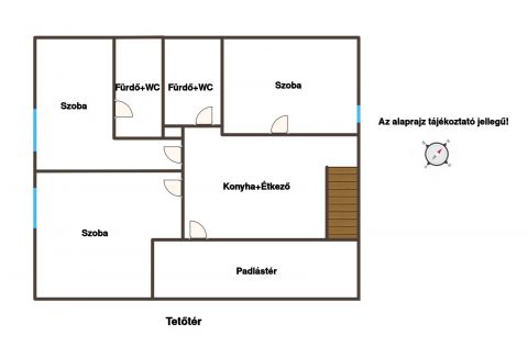A ház tetőterében konyha+étkező, 3 hálószoba, 2 fürdő+wc, valamint egy padlástér található.