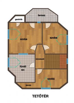 A tetőtérben három tágas hálószoba mellett egy szoba méretű, elegáns fürdőszoba található, dupla mosdóval, káddal és zuhanyzóval.