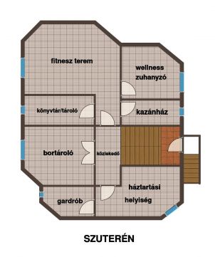 A szuterén belső lépcsőn és külön bejáraton keresztül is megközelíthető, itt bortároló/borozó, kazán- és háztartási helyiség, gardrób- és könyvtárszoba, fitneszterem és wellness helyiség kapott helyet.