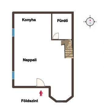 földszint: konyha, étkező és nappali egy légtérben, fürdőszoba,
