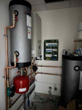A pufffertároló után a fűtési/hűtési vezetéken két szivattyús fűtési kör kerül kiépítésre úgy mint a padló fűtés valamint mennyezet hűtés.