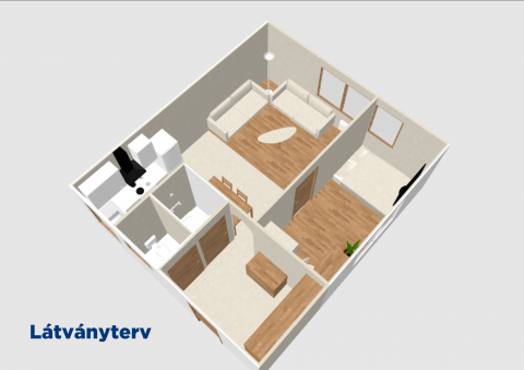Jelenlegi elosztását tekintve a fedett teraszról érhető el a zuhanyzó és a wc, majd az ingatlanba lépbe egy tágas nagy teret találunk ahonnan a kis konyha nyílik. Ez a felosztás könnyedén lehetővé teszi a lakhatóvá alakítást, melyet a látványtervek között egy példával szemléltetek is.