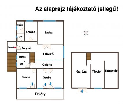 - emeleti részén: szoba, konyha, spájz, tágas étkező, közlekedő, toalett,