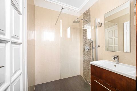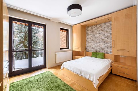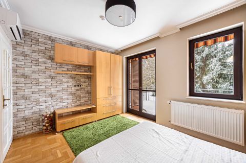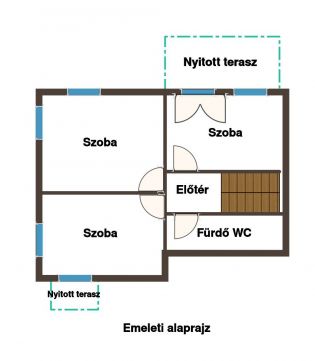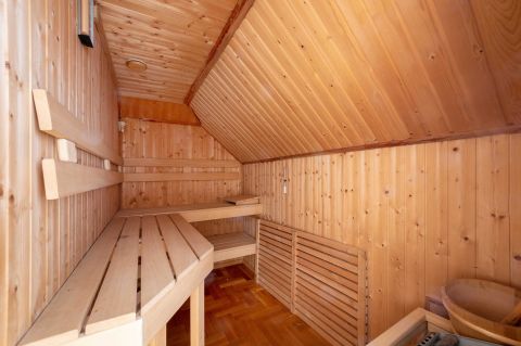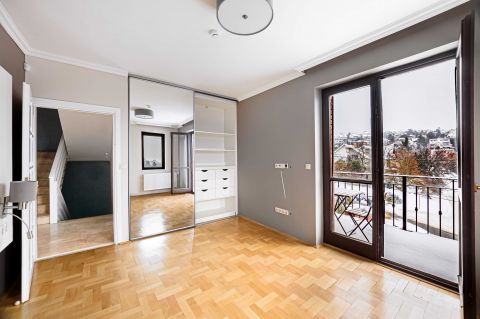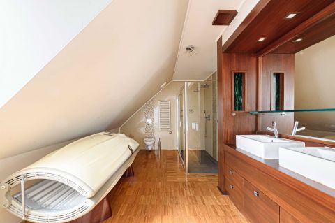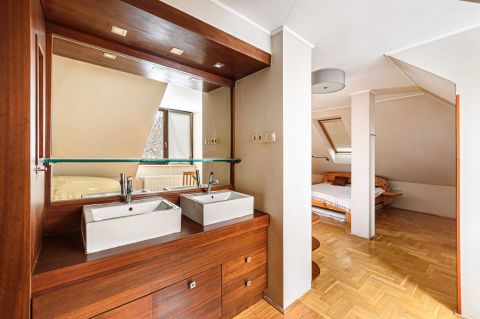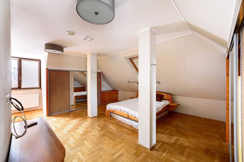 Az emeleten három különnyíló hálószoba teraszokkal (10 m2, és 4 m2), és egy fürdőszoba kapott helyet.A szobák mindegyike beépített gardróbbal , fűtő-hűtő klímával felszerelt. Kaputelefon az emeleti,és tetőtéri lakásokból is kezelhető. A tetőtérben egy hatalmas lakosztály kapott helyet egy légtérben a fürdőszobával ( dupla zuhanykabin, kétállásos mosdó, wc, szolárium), valamint beépített gardróbbal. Finn szauna is rendelkezésre áll.