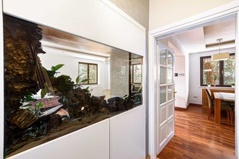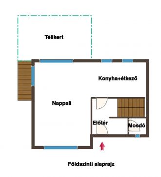 A földszinten tágas amerikai konyhás nappali étkezővel, melynek központi eleme a márványkandalló , valamint az előtér és nappali között átláthatóságot biztosító akvárium. A konyha teljeskörűen gépesített, hatszemélyes étkezővel felszerelt. A nappaliból közvetlen kijárat nyílik a 31 m2-es fedett, fűthető, tolható üvegajtókkal felszerelt teraszra, mely télen nyáron jól használható.A bejáratnál közvetlenül egy zuhanyzós wc, és egy gardrób.