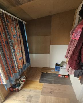 A kisebb épületbe belépve egy 8,8 nm es könnyűszerkezetes előtérbe jutunk a konyha érkező rész tágas 18,4 nm, a hálószoba 13,6 nm, a fürdőszoba és a wc 3,4 nm.