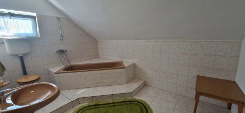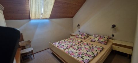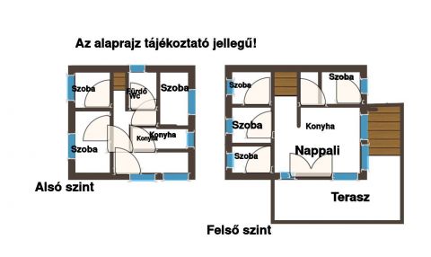 A felső szint elosztása, nappali - étkező, konyha, 2 db fürdőszoba,-wc, és 2 szoba található. Erre a szintre külső és belső lépcsőn is fel lehet jutni. A harmadik szinten 2 szoba, fürdőszoba, konyha található.