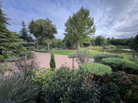 Az udvar különlegessége a 2 250 m² vízfelületű, 2,5 méter mélységű speciális tófóliával ellátott kerti tó, mely kivételes hangulatot kölcsönöz az ingatlannak.