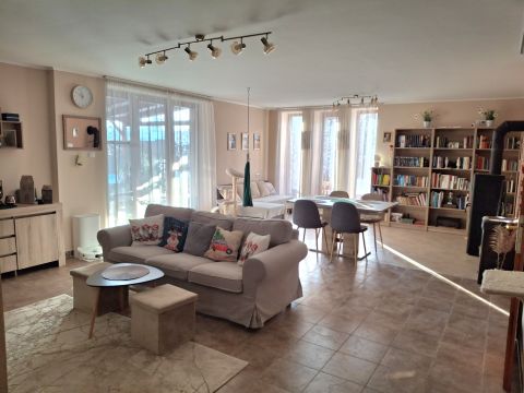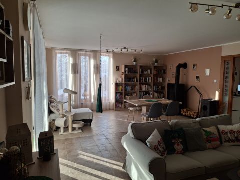 A nappaliból egy kellemes, 16 m2-es, a közelmúltban felújított teraszra is kiléphetünk, mely remek helyszíne lehet pihenésnek, játéknak. A ház ezen része azonnal költözhető állapotú, ízlésesen berendezett. A teljes ingatlan rendszeresen karbantartott.