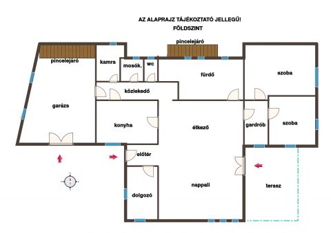 A földszint közel 152 m2-én kapott helyet a ház központi részén elhelyezkedő nagy méretű nappali, étkező, valamint két háló, gardrób, egy dolgozószoba, tágas fürdő, konyha, kamra, mosókonyha, külön mellékhelyiség és egy elektromos billenőkapuval ellátott fűthető garázs.
