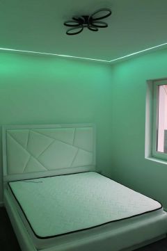A mennyezeten dekorvilágítás gondoskodik a hangulatos fényekről, így a nappali este is különleges atmoszférát áraszt.