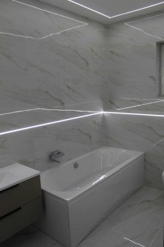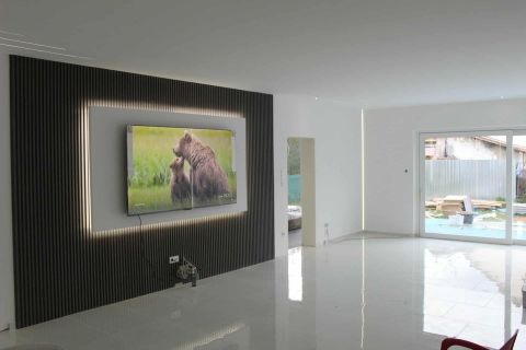 A nappaliban egy impozáns tévéfal kapott helyet, beépített LED hangulatvilágítással és látványkandallóval, ami különleges, otthonos hangulatot biztosít.