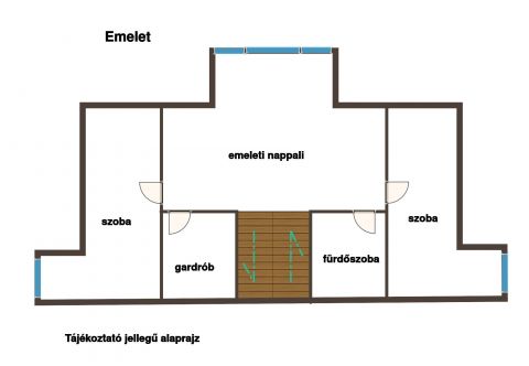 Az emeleten egy óriási 'gyerek nappali', két hálószoba, egy fürdőszoba és egy gardrobe található.