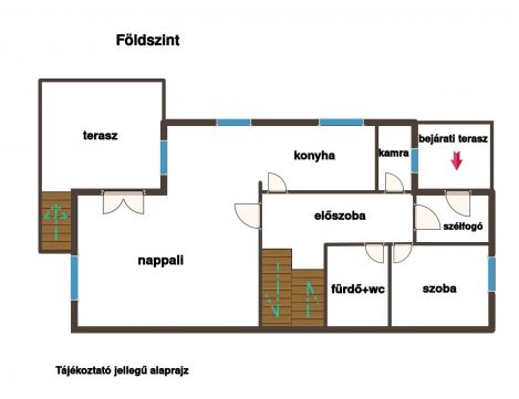 A földszinten a nagy méretű nappali és szintén tágas konyha, egy hálószoba és egy fürdőszoba kapott helyet, illetve a nappaliból kilépve itt található a hangulatos, fedett terasz, melyről közvetlen lejárat van a lakópark kertjébe.