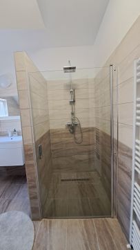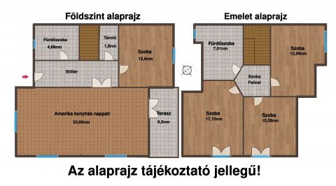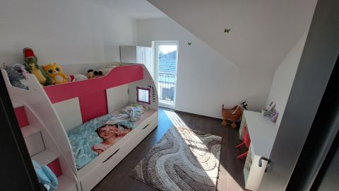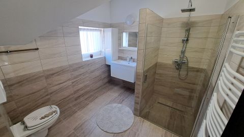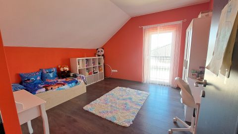 Az emeleten egy tágas, zuhanyzós fürdőszoba és három nagyméretű, különnyíló szoba található, melyek az emeleti előtérből nyílnak, így minden családtagnak jut saját, jól használható tér.