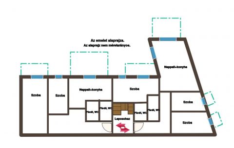 két lakás az emeleten, részben tetőtér-beépítéssel, melyek közös lépcsőházból közelíthetők meg.
