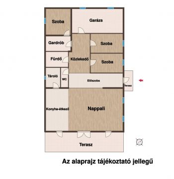 A ház központi tere a világos, amerikai konyhás nappali, amely közvetlen kapcsolatban áll a terasszal és a gondozott, füvesített kerttel tökéletes helyszíne lehet családi és baráti összejöveteleknek. Jelenlegi kialakításában három szoba áll rendelkezésre, de az alaprajz egyszerűen négy szobássá alakítható. Emellett külön gardróbszoba és tároló is szolgálja a kényelmet és a praktikus helykihasználást.