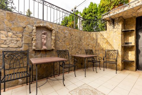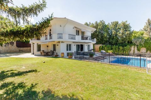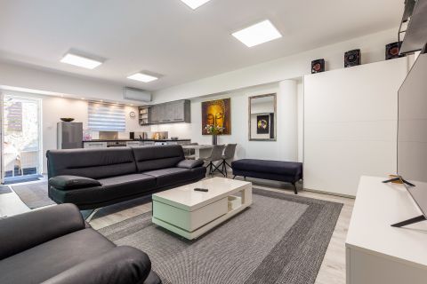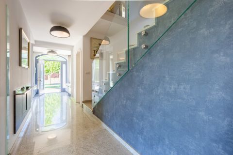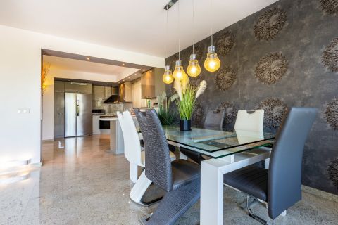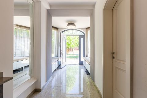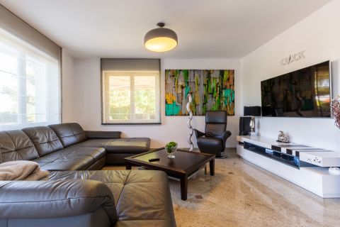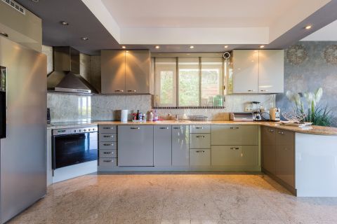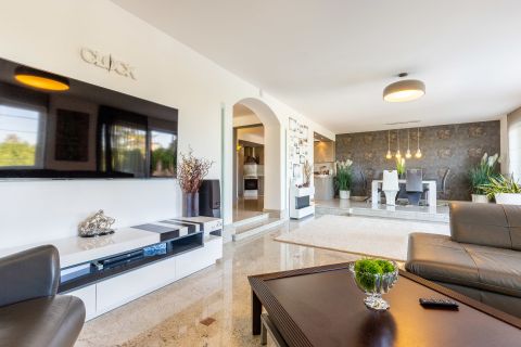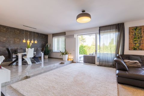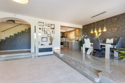 A földszinten (150 m2) helyezkedik el a tágas előtér, nappali-konyha-étkező Innen jutunk a 50 nm-es, déli tájolású teraszra, illetve innen közvetlen a kertkapcsolat a fűtött medencéhez. Ugyanitt található még egy 63m2-es két állásos fűtött garázs illetve további 4 gépkocsi részére felszíni beálló.