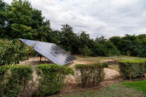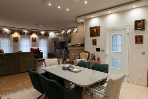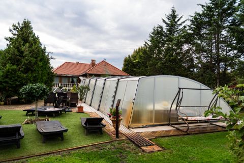 A telek gyönyörűen parkosított, automata öntözővel felszerelt. Az udvaron 60 nm-es zárt szaletli mellett egy 10m x 5.5m x 1.80m medence is helyett kapott, mely fedele mozgatható, téliesíthető. A kert hátsó részén játszótér, sütögető és 2 faház kapott helyet. Az energia ellátása érdekében 25 kv-os napelem rendszert telepítettek, mely szaldós elszámolású.
