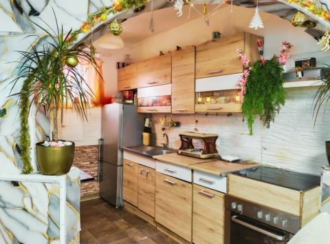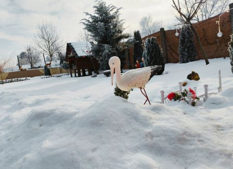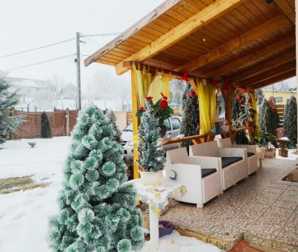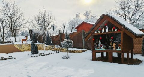 Az ingatlan udvara rendezett, kisebb szobrok, kerti díszek teszik egyedivé hangulatát, tavasztól őszig telis-teli virággal, növényekkel.