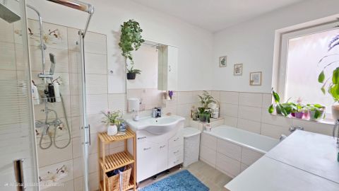 A két lakrész között egy 17 m²-es, saját fürdővel ellátott helyiség található (jelenleg mosókonyha / fitnesz), amely akár külön dolgozószobaként vagy vendégrészként is használható.