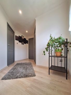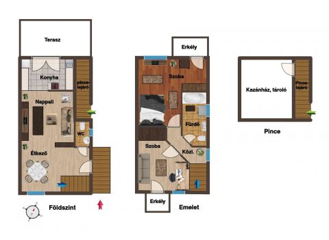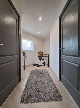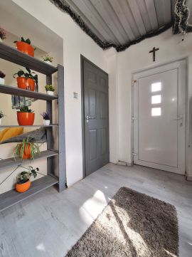 A ház elrendezése kiváló, a földszinten egybefüggő amerikai konyhás nappali található, valamint egy különálló mellékhelyiség, míg az emeleten 2 kényelmes szoba, és egy közlekedőről nyíló fürdőszoba kapott helyet. A helyiségek parkettával és járólappal burkoltak, a beltéren dekor ajtók találhatók antracit színben. Minden helyiség szellőztethető, penésznek, repedésnek nyoma sincs a házon. A beépített egyedi polcok, falelemek egyedi, modern, fiatalos hangulatot hoznak a terekbe.