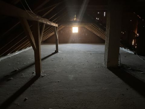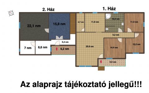 6,2 nm fedett terasz, előszoba, konyha, mosdó, wc, nappali, szoba, padlásra vezető lépcső. Ennek az ingatlannak a padlásáról van átjárás a nagy ház padlására is.