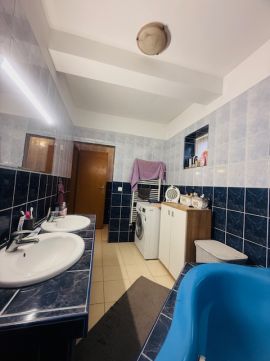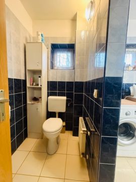 A fürdőszoba kialakítása megtörtént, de a burkolatok és végső munkálatok még pótlandók.