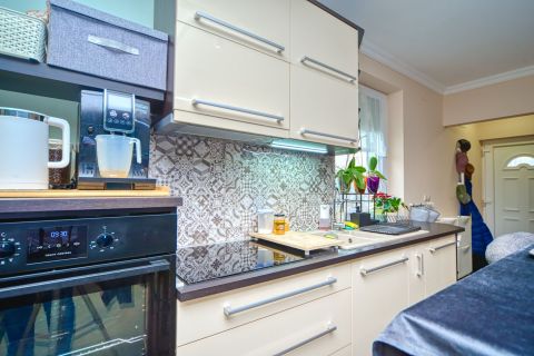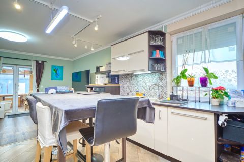 + földszinten igazán jó elosztása révén a nappalin kívül egy hálószoba is van. Ezen kívül egy minden igényt kielégítő konyha is be lett rendezve, ahol még az étkező is elfér,