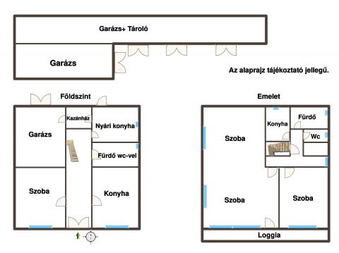Földszint: előszoba, konyha, nappali, fürdőszoba WC-vel, nyárikonyha, kazánház, garázs.