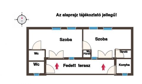Az ingatlan elosztása: 2 szoba, 2 db wc, fürdőszoba-wc, konyha, tároló, és egy 28 nm-es fedett terasz kialakítású.