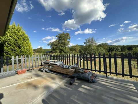 közvetlen kijárat a nappaliból a tágas teraszra minden reggel napfényes erdei panorámával.