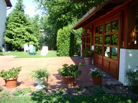 Gondozott, elegáns kertjében az apró generáció tagjainak játszótér, a felnőtteknek sütögető hely biztosítja a szabadtéri kikapcsolódást.
