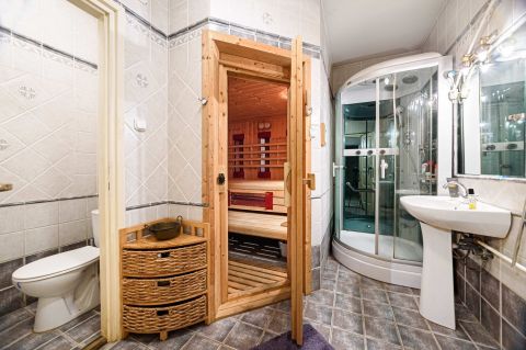 Az alsó szint valódi különlegesség: wellness részleg fin- és infraszaunával, zene szoba, mosókonyha, valamint további kiszolgáló helyiségek szolgálják a kényelmet és a kikapcsolódást. A három szinten végig gondosan megtervezett tárolók és gardróbok diszkréten simulnak bele az enteriőrbe.