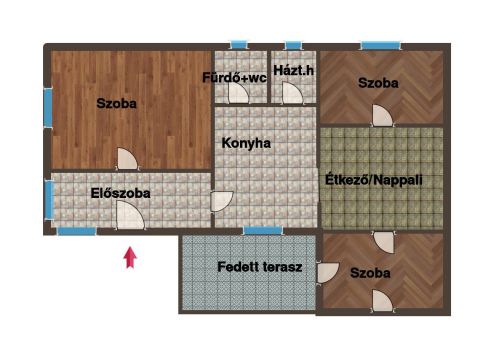KIALAKÍTÁSA: 3 szoba ( tágas utcafronti szoba: 14.82 m2 ), konyha, étkező, fürdő+wc, háztartási helyiség, 2 szoba, étkező, fedett terasz.
