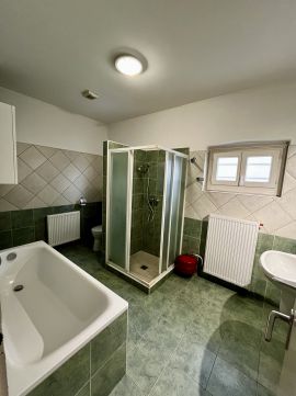 nagyméretű fürdőszoba káddal és zuhanyzóval