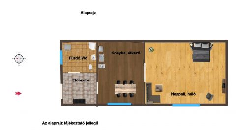 Minőségi burkolatok: A konyha-étkező praktikus, vízálló laminált padlót, az előszoba és a fürdő elegáns hidegburkolatot, a hálószoba pedig természetes, meleg tapintású hajópadlót kapott.
