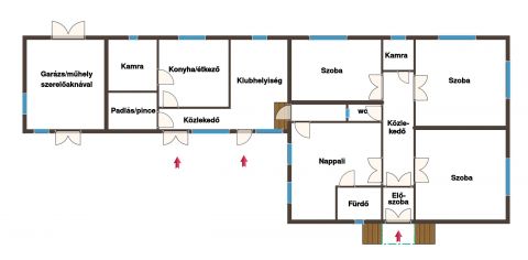 Található benne 4 szoba, előszoba és közlekedő, gardrób, fürdő, wc, előszoba, majd a ház folytatásában külön bejárattal is rendelkező klubhelyiség, közlekedő, konyha-étkező, valamint 2 kamra, illetve pince. A szerelőaknás garázs is az épülethez kapcsolódik.