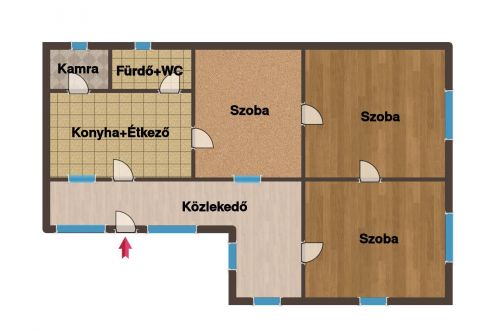 - 102 m2-es ház, 3 szoba, konyha + étkező, fürdő + WC, kamra