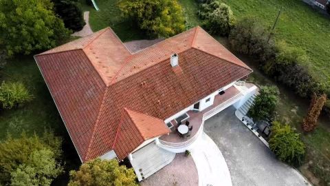 Széles, díszburkolattal fedett behajtóról íves lépcsősor vezet az épület bejáratához, ill. a teraszra, ahonnan csodálatos kilátás nyílik a Dunakanyarra!